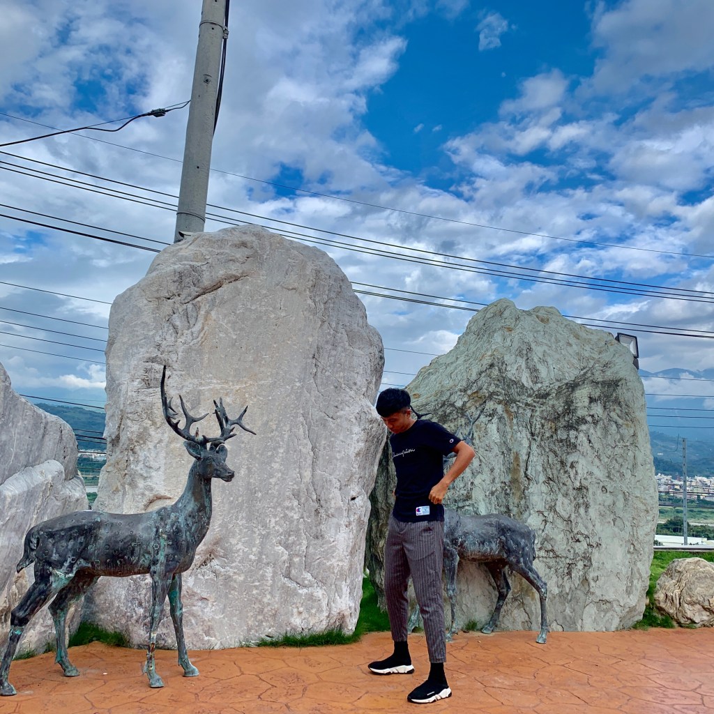 在逛園區的途中,發現了兩隻迷人的雕像鹿與許多大石,順手跟他們拍了一張照(穿了居家的搭配)